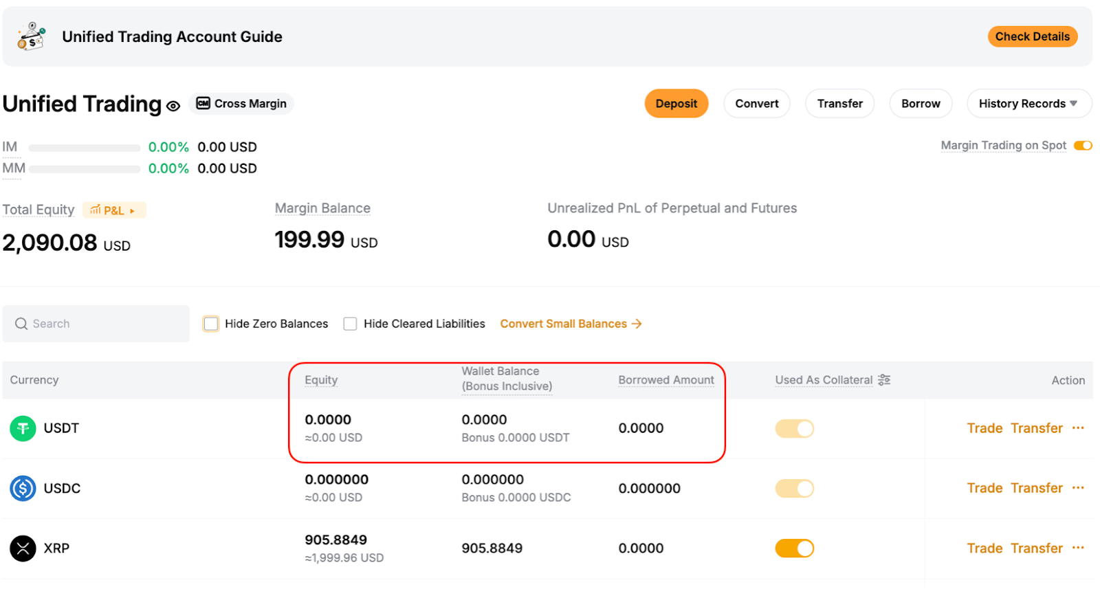 Paso 1: Vaya a la página de la Cuenta de trading unificada, haga clic en el botón Reembolsar junto a la columna de la moneda respectiva . Se admiten reembolsos totales y parciales.