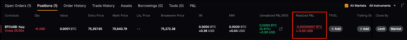 Utilizando al Trader C como ejemplo, el Trader C mantiene una posición de venta abierta de BTCUSD de 1000 de cantidad con un precio de entrada de 70 000 USD. Cuando el último precio de cotización en el libro de órdenes es de 65 000 USD, el trader C decidió cerrar toda la posición mediante la función Cerrar a mercado. Suponiendo que el Trader C también abrió la posición mediante una orden de mercado y que se pagaron comisiones de financiación por un total de 0,00005 BTC mientras mantenía la posición.