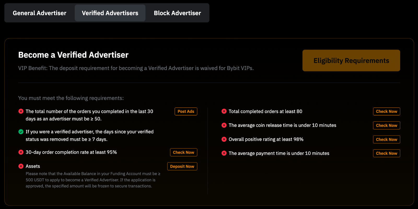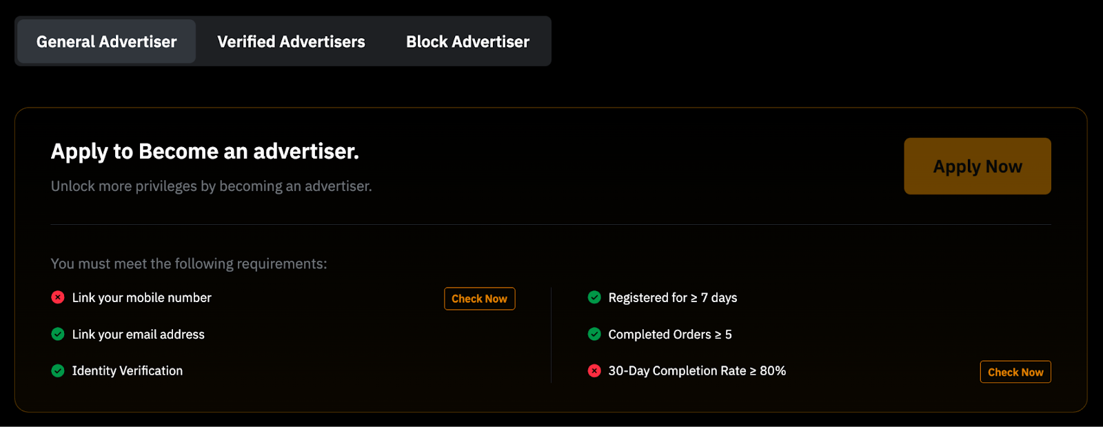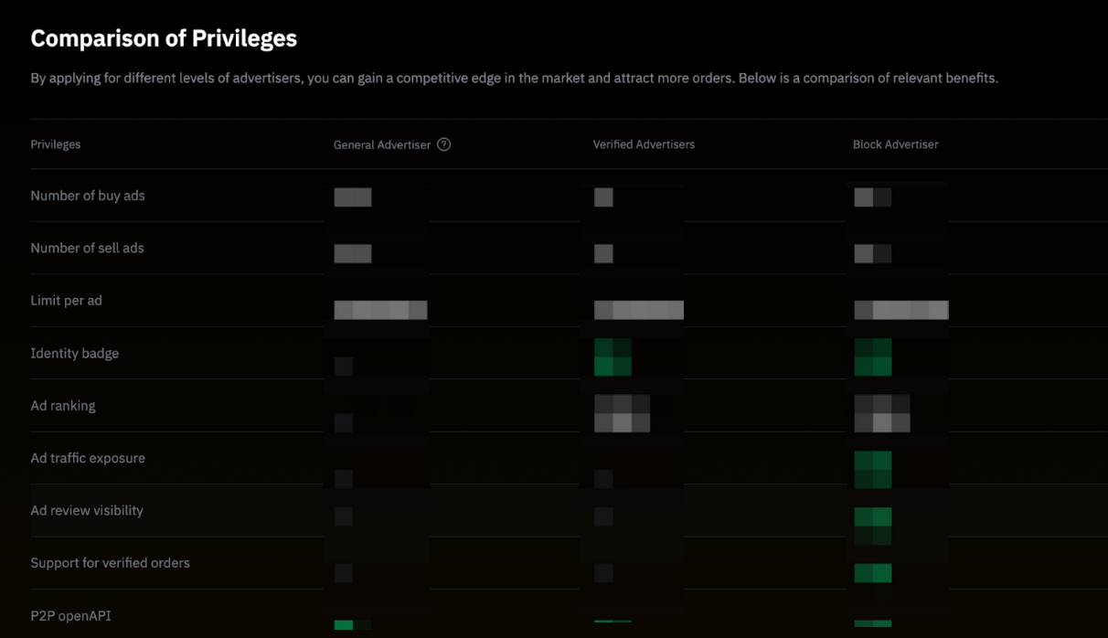 Para convertirte en anunciante P2P, dirígete a la página Privilegios del Anunciante para consultar los requisitos de cada tipo de anunciante.