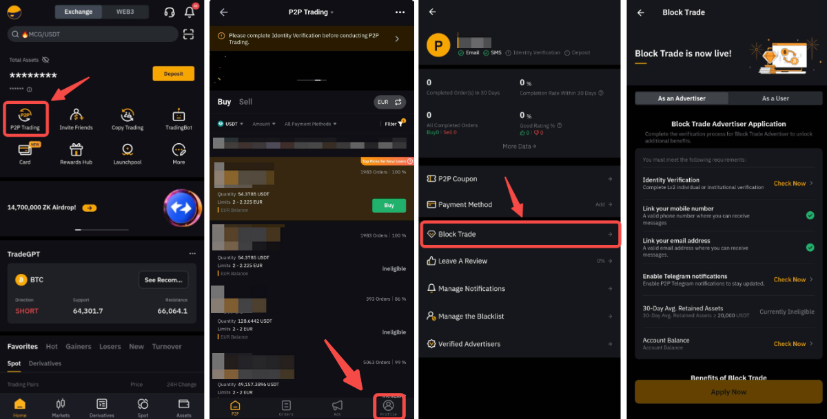 Los traders P2P también pueden convertirse en anunciantes de Block Trade si tienen la intención de comprar y vender grandes cantidades de criptomonedas.