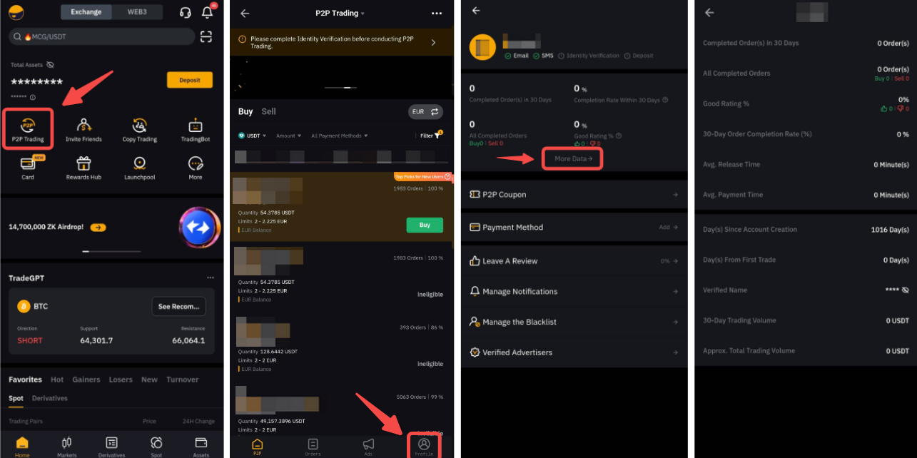 Si estás en la aplicación, ve a la página P2P y toca el icono Perfil para abrir el Centro de usuarios P2P. Allí, pulsa en Más datos para mostrar tu información de trading P2P.