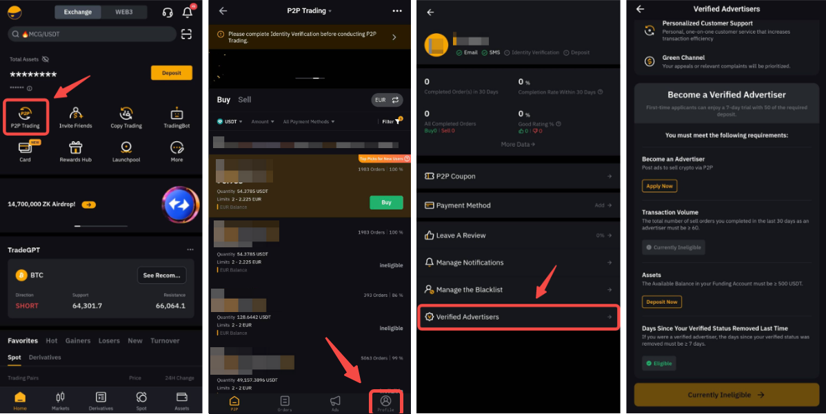 Si estás en la aplicación, ve a la página P2P y toca el icono Perfil para abrir el Centro de usuarios P2P. Toca en Privilegios del anunciante para mostrar la página Privilegios del anunciante.