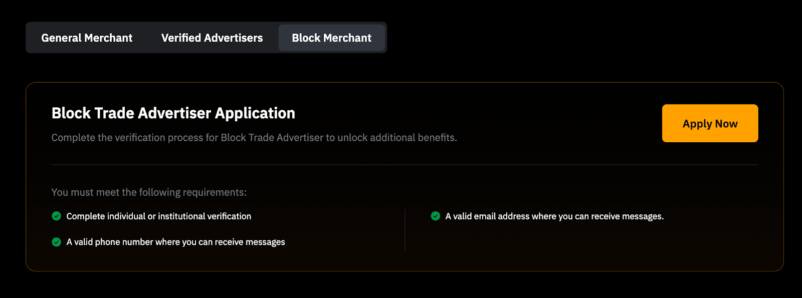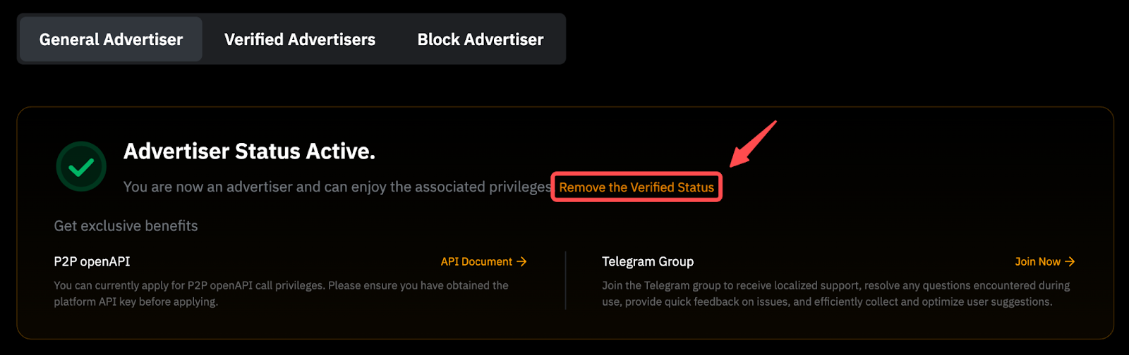 Para convertirte en Anunciante Verificado o Anunciante de Bloque, puedes consultar los requisitos respectivos y solicitar convertirte en uno visitando la página Programa de Anunciantes P2P.