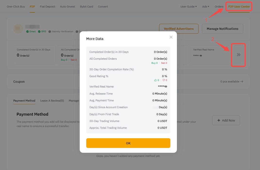 Para comprobar si cumples los requisitos para uno de los niveles generales de anunciante, consulta los datos de tu cuenta de trading P2P haciendo clic en Centro de usuarios P2P y, a continuación, en el icono de las 2 flechas derechas del sitio web.
