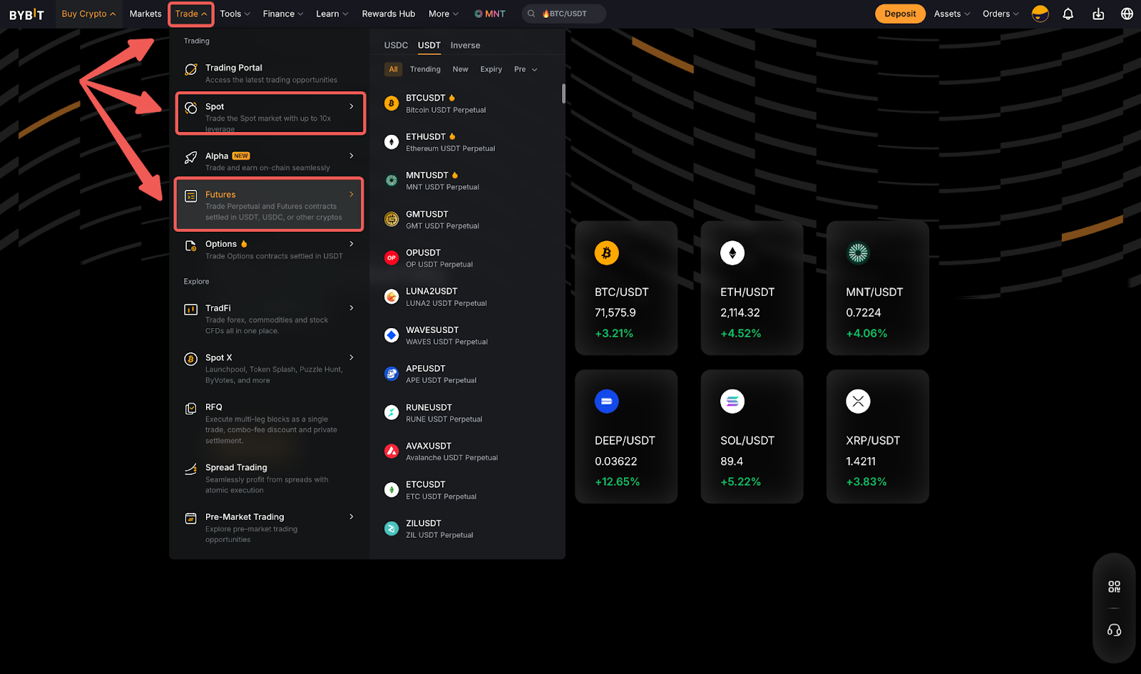 Paso 1: En la página de inicio de Bybit, vaya al menú desplegable Trade y seleccione el trading en Spot o Futuros. A continuación, elija el contrato con el que desea operar.