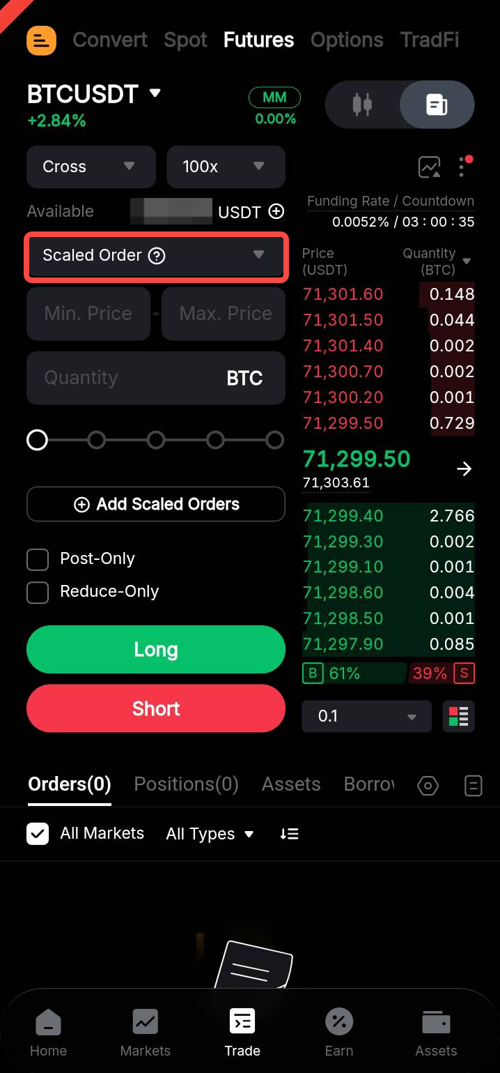 En la aplicación, ve a la pestaña Operar. Toca el menú desplegable de tipo de orden, selecciona Órdenes escaladas e introduce tu Rango de precios preferido (el límite superior e inferior de tu orden escalada) y la Cantidad de tu orden escalada.