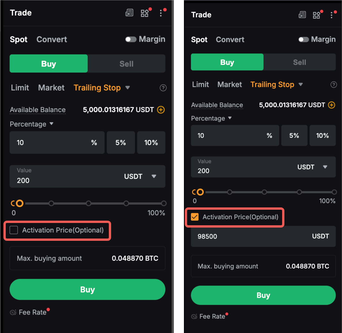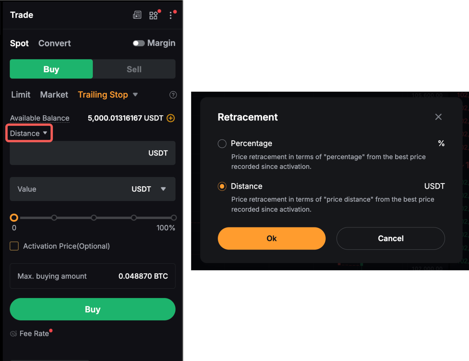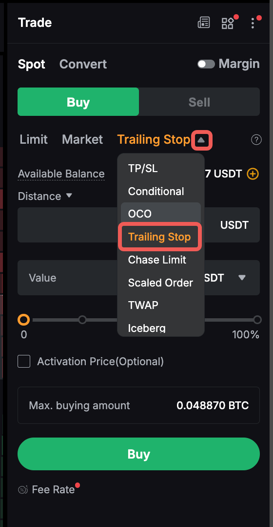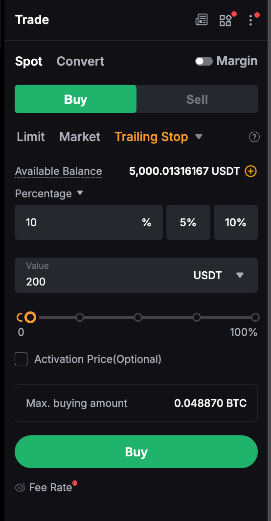 La Trailing Stop en las operaciones spot y de margen es un tipo de orden dinámico que funciona como una característica mejorada para comprar y vender. Funciona como una orden de detención que realiza un seguimiento del precio de mercado de un activo o posición y ajusta automáticamente la orden de detención para minimizar la pérdida o bloquear los beneficios a medida que el precio se mueve a favor del comerciante. Una vez que se determina la Parada de arrastre, si el precio de mercado alcanza un determinado nivel y luego vuelve a rastrearse en una cantidad predeterminada establecida por el usuario, se activará una orden de mercado.