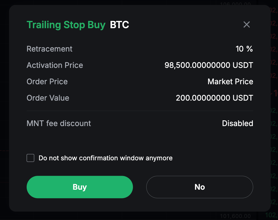 1. Orden de compra: Precio más bajo + Distancia de rastreo o Precio más bajo x (1 + Porcentaje de rastreo)