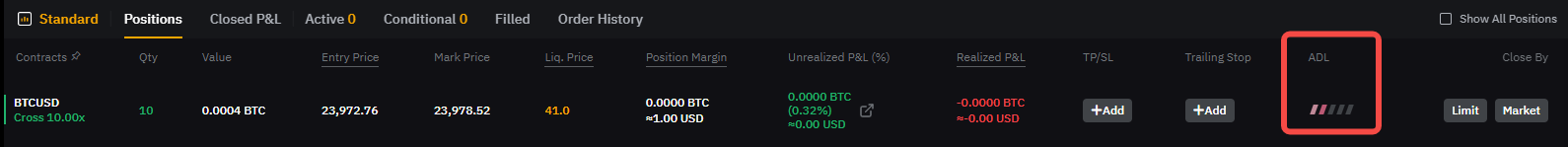 • ADLランキングが最も高いトレーダーが最初にデレバレッジの対象として選択されます。トレーダーは、自身のポジションに表示されるADL優先度ライトを参照して、ADLランキングを把握できます。