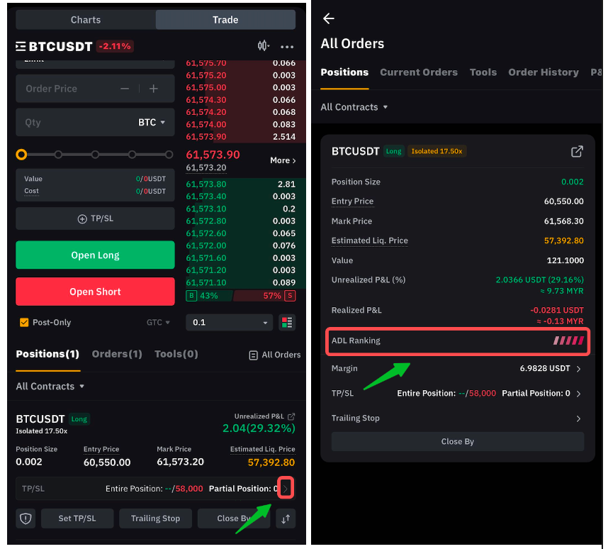 • レバレッジの高いポジションを部分的に決済することで、ADLリスクにさらされる契約数を減らすことができます。ただし、ADLランキングが下がるわけではありません。