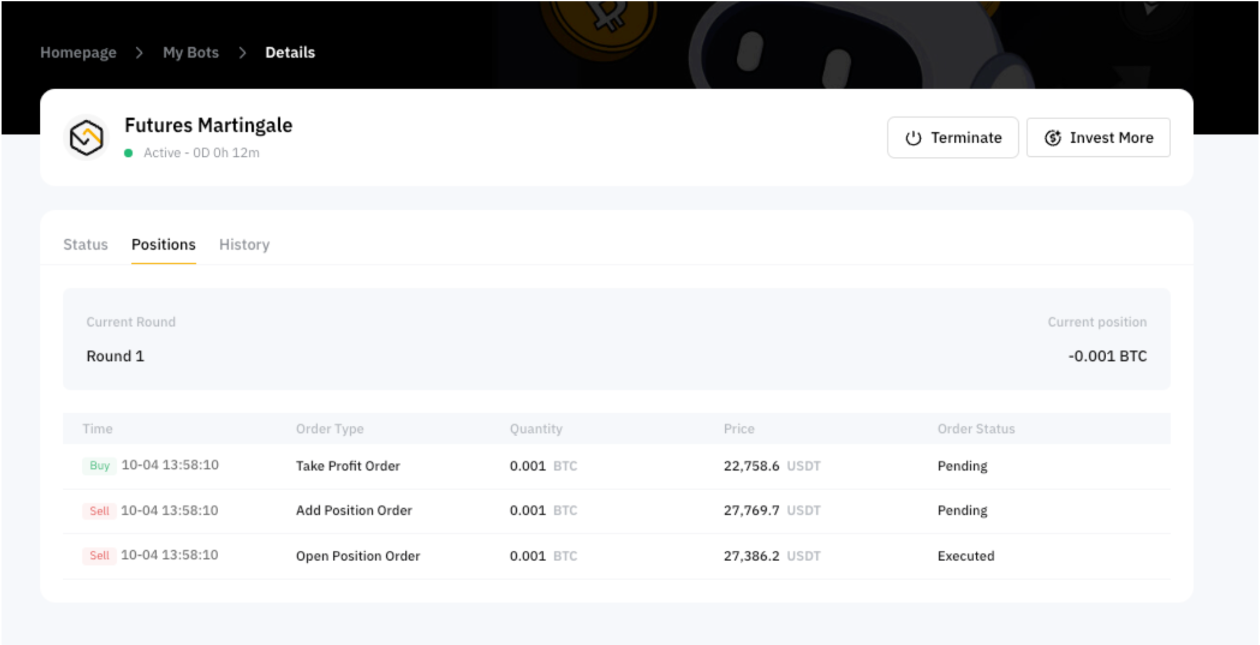 Предположим, начальная цена входа для лонг-позиции Мартингейл-бота составляет $10 000, а снижение цены установлено на уровне 1%. Когда цена снизится на 1% до $9 900, ордер будет исполнен.