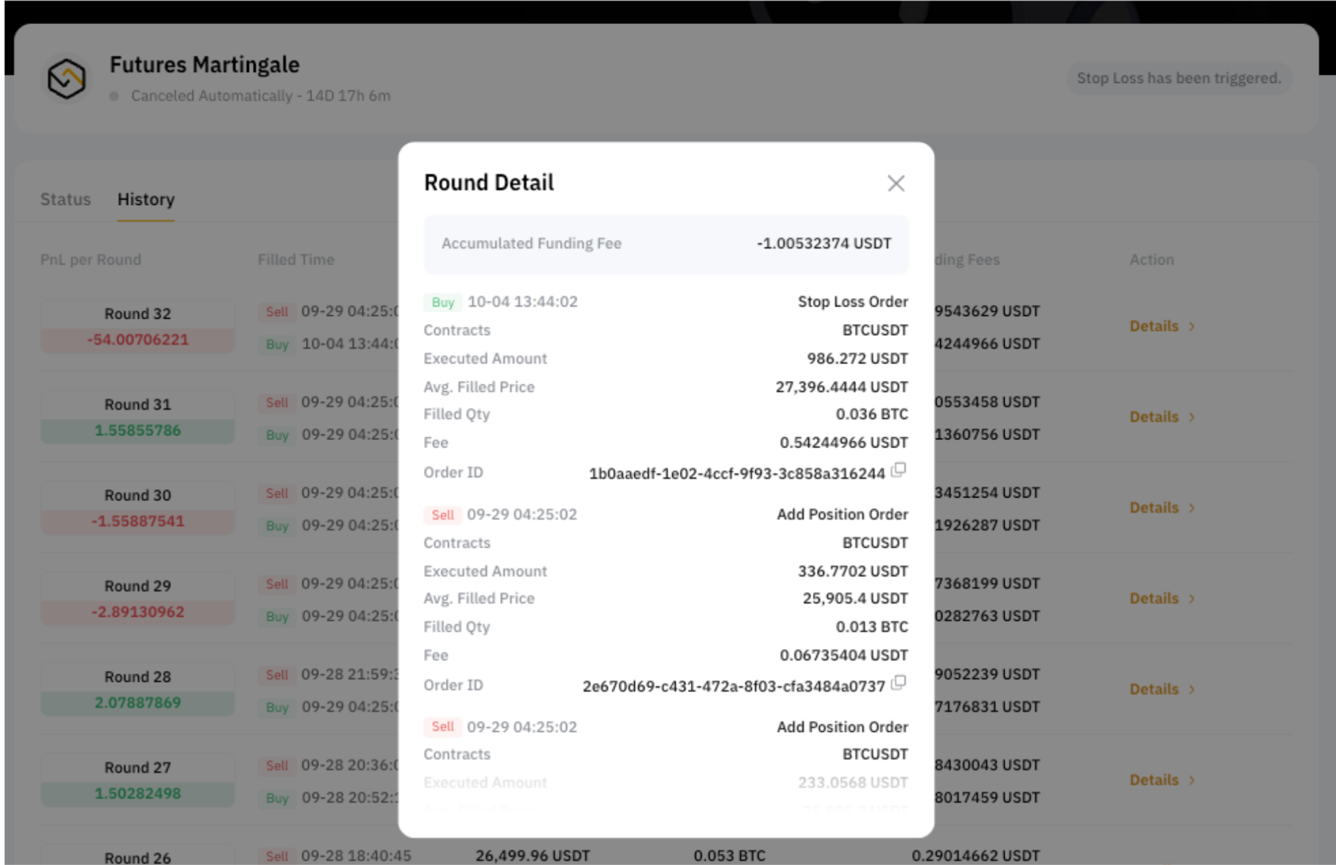На странице истории бота отображаются реализованные P&L по предыдущим раундам. Нажмите «Детали», чтобы увидеть историю ордеров и комиссии по каждому раунду.