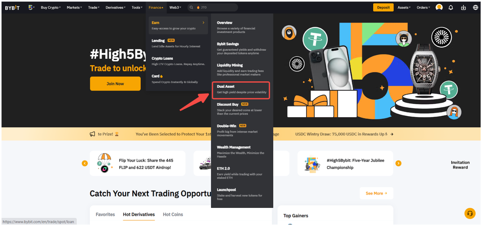 Шаг 1. Для перехода на страницу Бивалютных инвестиций в панели навигации нажмите Финансы → Earn → Бивалютные инвестиции.