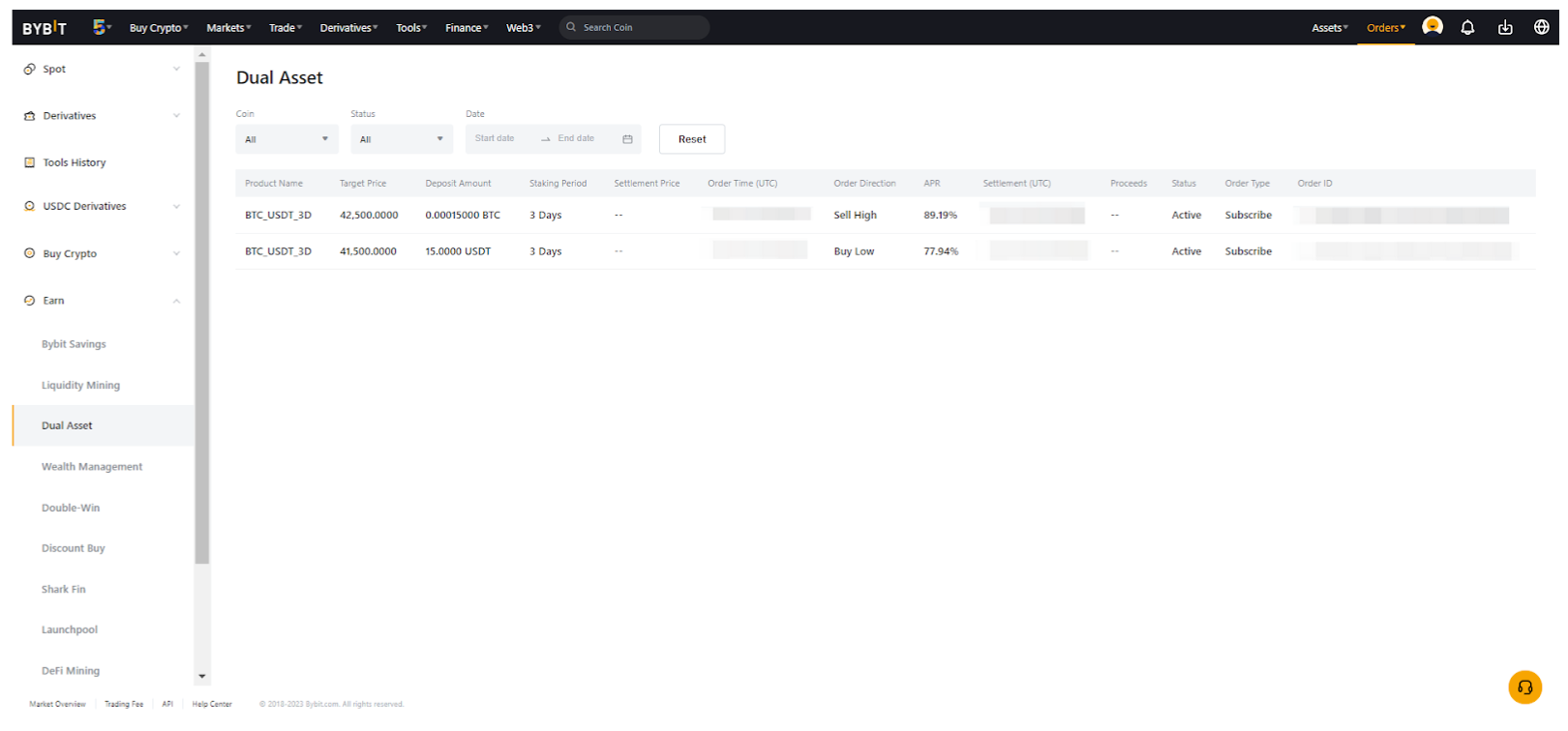 История ордеров на Бивалютные инвестиции: на этой странице также будет указан статус ваших ордеров, а также эффективная прибыль и цена расчёта для всех завершенных планов Бивалютных инвестиций.
