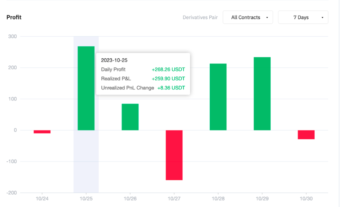8 січня 2023 року нереалізований прибуток і збиток (UPL) трейдера В становить +2300 USDT, а торгові результати за останні сім (7) днів такі: