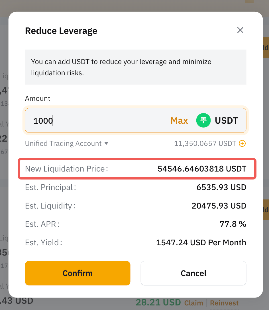 請注意,您可以追加的 USDT 最大金額屬於槓桿貸款的一部分。 當您添加最大金額時,您的倉位槓桿將降低至 1 倍。